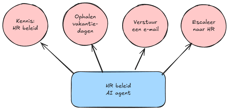 AI agents kunnen dus heel goed omgaan met ongestructureerde data en processen. Kan de HR-beleid agent het antwoord op een vraag niet vinden? Dan kan hij deze vraag doorsturen (escaleren) naar een HR-medewerker.