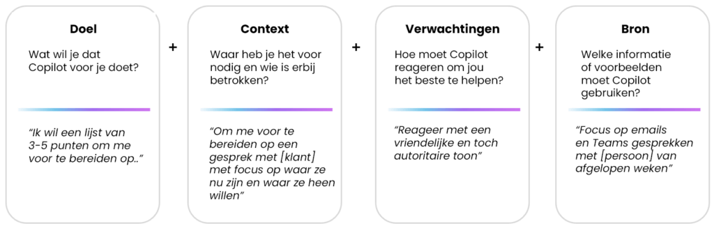 Zoals je kunt zien start het framework van Microsoft met het allerbelangrijkste: het doel. Wat wil je dat ChatGPT / Copilot voor je doet?