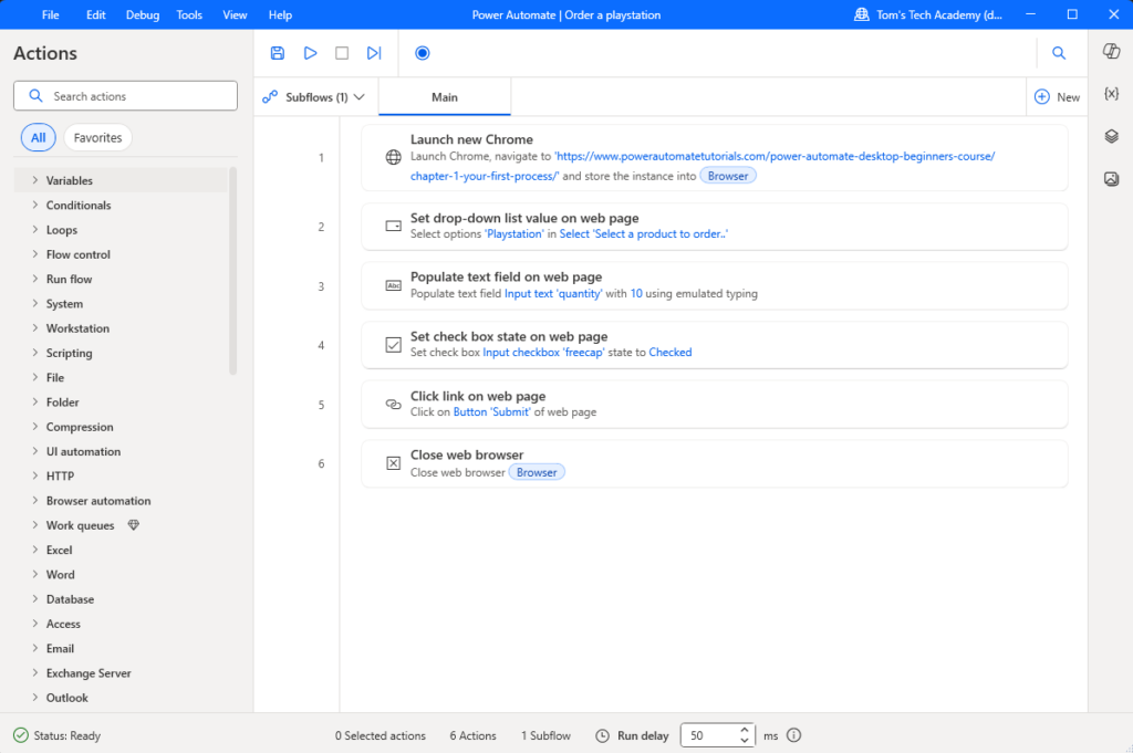 In onderstaande afbeelding zie je een voorbeeld van hoe een RPA-bot wordt gebouwd in Microsoft Power Automate Desktop. Dit is helemaal low-code, je hoeft dus niet te kunnen programmeren.